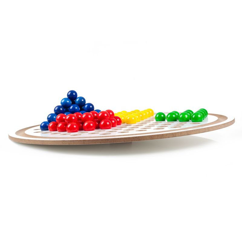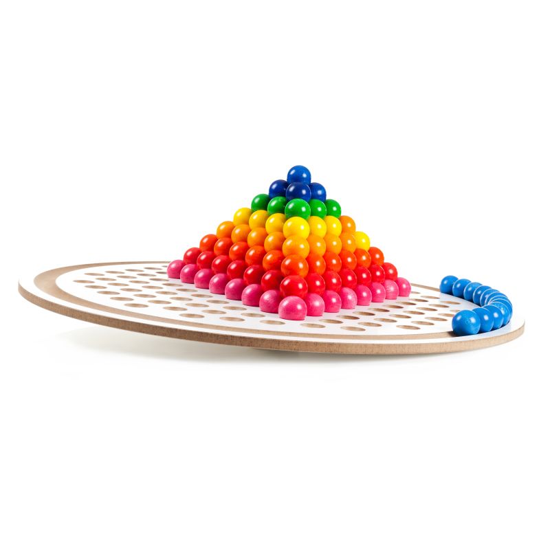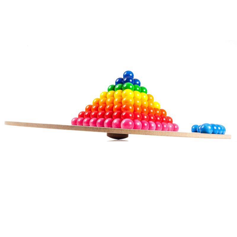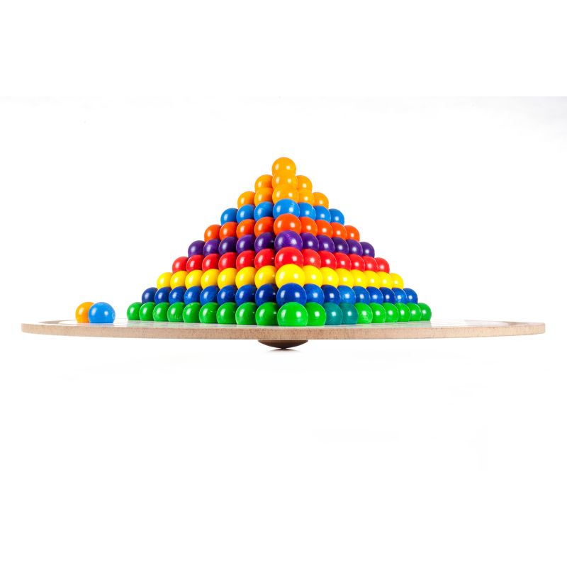 Auf der Unterseite des Balancierbretts ist mittig ein flacher Kreisel befestigt. Auf dem Brett wird mit den Kugeln gebaut. Das Brett neigt sich oder schwingt sanft mit dem Gewicht der Kugeln. Es verlagert beim Bauen sein Gleichgewicht. Mit Kugeln bestückt kann es sogar angeschoben und wie ein Kreisel gedreht werden, wenn die Kugeln das Brett in Balance halten. Es gibt keine Regeln, aber unzählige Möglichkeiten für freies und spielerisches Experimentieren. Das Spiel mehrerer Kinder an einem „Projekt“ fördert den Teamgeist!