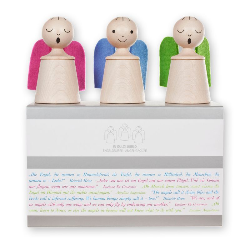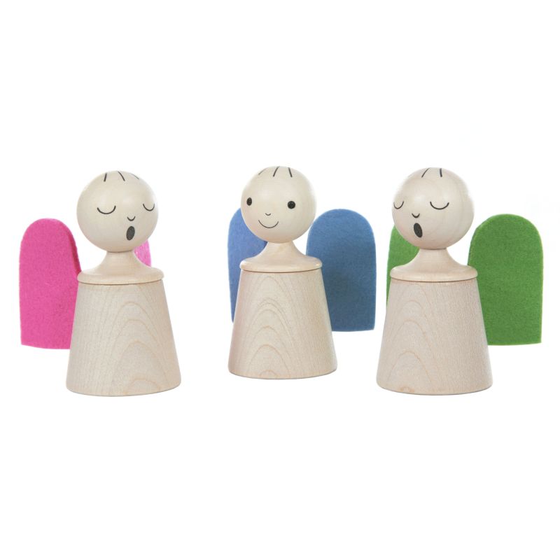 Holzspielzeug - kleine Engelgruppe für Kinder Advents- und Weihnachtsdekoration ist für Kinderhände oft zu filigran gearbeitet und nicht zum Spielen gedacht. Die SINA-Engel sind für Kinder gemacht. Beim Schütteln der Figuren erklingt ein Glöckchen.