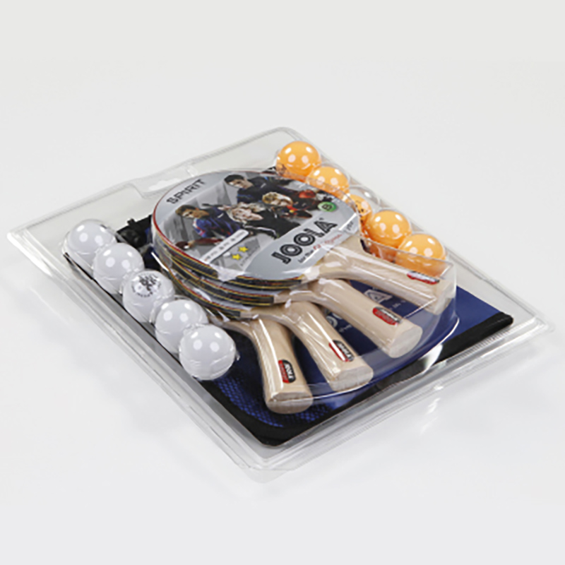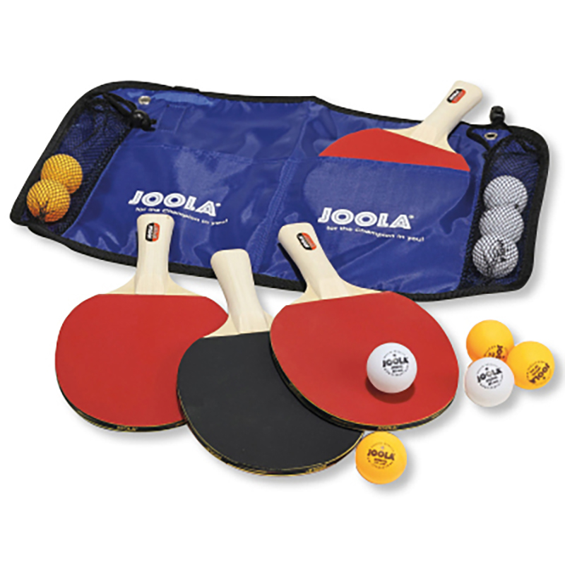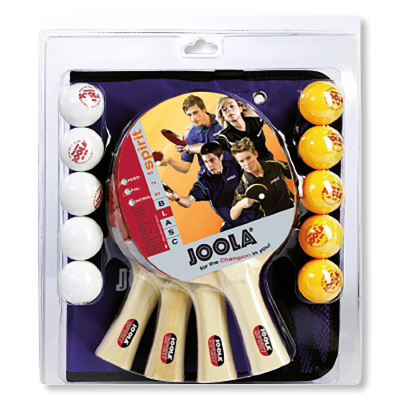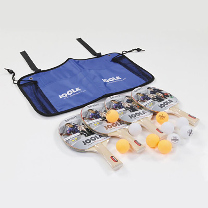 Tischtennis-Set mit 4 Schlägern JOOLA Spirit und 10 Bällen (5 x weiss & 5 x orange) in praktischer Aufbewahrungstasche, die auch am Tisch befestigt werden kann.