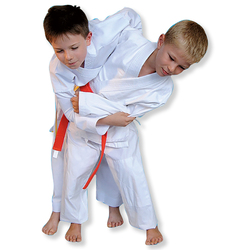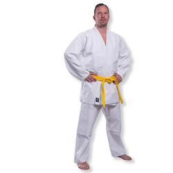 Klassischer, leichter aber strapazierfähiger Judoanzug aus Baumwolle. Ein idealer Anzug für Judo Anfänger oder Einsteiger. Das Oberteil der Jacke in Reiskornwebung mit diversen mehrfach vernähten Schulter- und Brustverstärkungen, das Unterteil der Jacke mit durchgewebtem Muster. Die Hose hat einen elastischen Gummibund und Knieverstärkungen für den Bodenkampf. Der Anzug ist auch in kleinen Grössen erhältlich und deshalb für Kinder und Einsteiger geeignet, auch für Aikido und Ju-Jutsu. Judo Anzug komplett in weiss, inklusive Gürtel ebenfalls in weiss