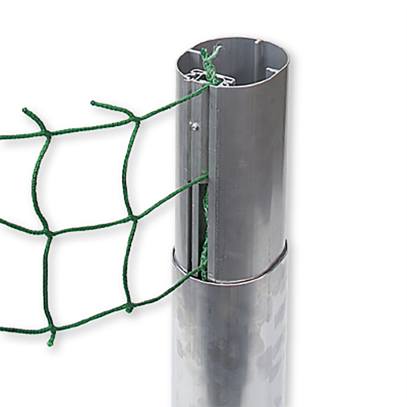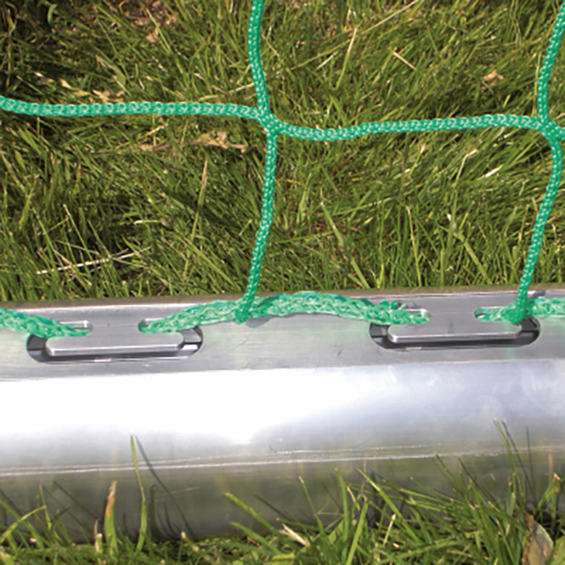 Torrahmen aus Aluminium-Ovalprofil 120 x 100 mm, Bodenrahmen aus Aluminium-Rechteckprofil, 80 x 40 mm, mit eingefräster Smart Netzaufhängung. Netzbügel aus Aluminium-Rundrohr ø 60 mm. Die Torpfosten-Ecken sind zusätzlich innenverstärkt. Nur für Netze bis max. 4 mm Schnurstärke.