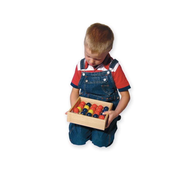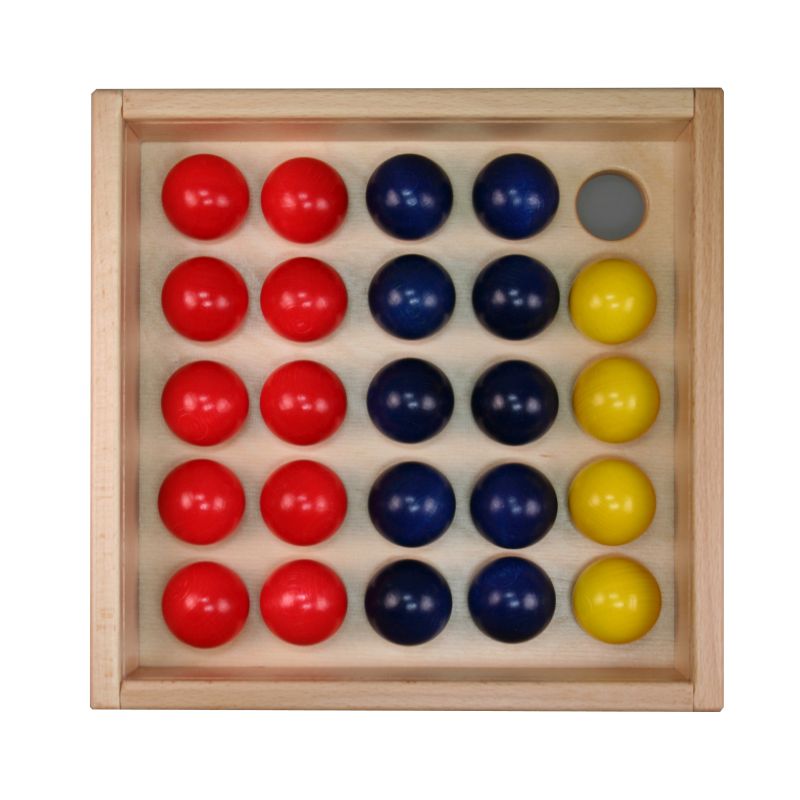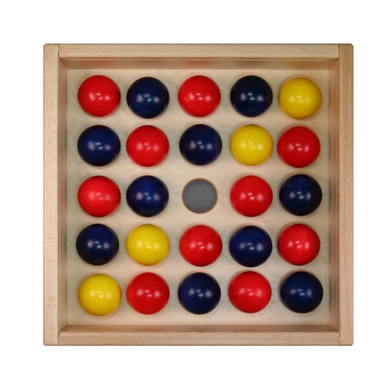 Das Spiel besteht aus einem handlichen Holzkasten mit einem durchlöcherten Boden. Durch die Scheibe aus Acrylglas können wir im Kasten 24 Holzkugeln sehen. Jede Kugel liegt in einem Loch – eins bleibt frei, damit wir die Kugeln bewegen können. Die Kugeln können nicht herausgenommen werden und können nicht verloren gehen. Angeregt werden ganz besonders Fähigkeiten wie Geduld und Konzentration. Das Spiel eignet sich sowohl für ein Kind in der Familie als auch für die Gruppe im Kindergarten. Das Spiel hat sich bereits in therapeutischen Bereichen sehr gut bewährt. Die Grösse des Holzkastens ist so gewählt das wir mit beiden Händen gut zugreifen können. Wir haben etwas fest in der Hand und es fasst sich gut an. Der Holzkasten mit den schönen farbigen Kugeln schmeichelt den Augen und Händen. Das Spiel weckt unsere Sinne – wir fühlen, denken, sehen, hören und gestalten immer wieder unsere eigenen Muster.