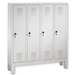 Schrank auf 150 mm hohen Füssen. Türen rechts gebandet mit Lochbild und eingeprägtem Etikettenrahmen. Pro Abteil 1 Ablageboden und 1 Garderobenstange mit 3 Schiebehaken. Drehriegelverschluss für bauseitiges Vorhängeschloss.