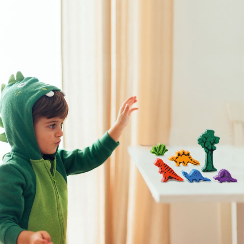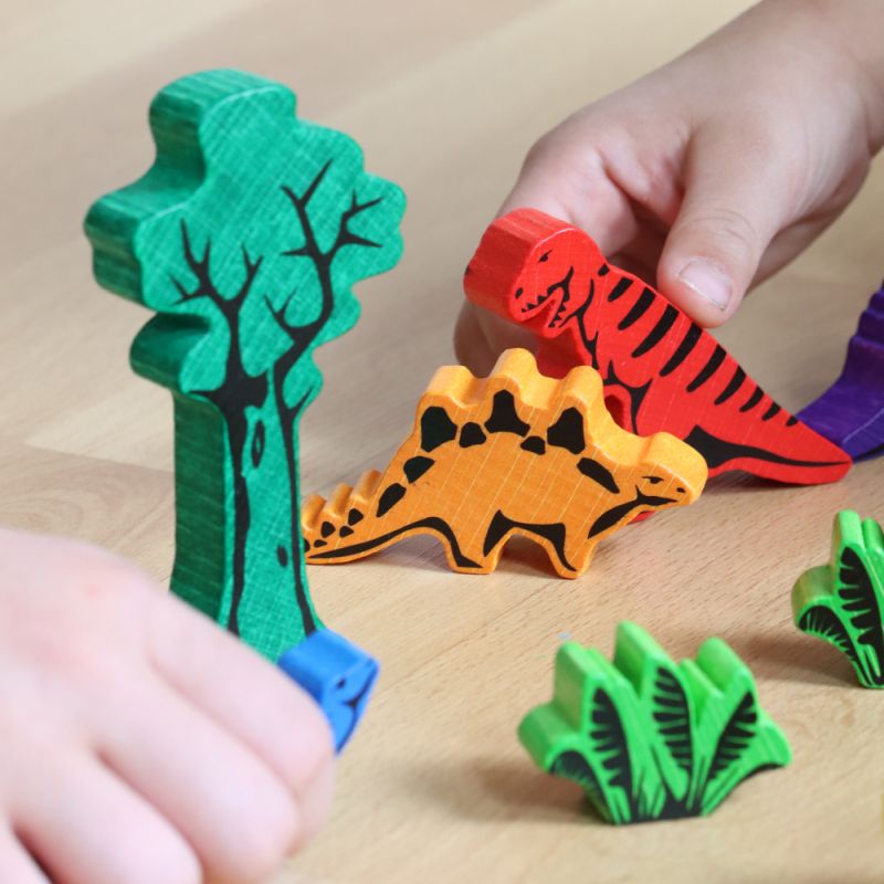 Unsere Dinosaurier beleben nicht nur als Rollenspielzeug jedes Kinderzimmer. Die Formen der einzelnen Saurier sind so harmonisch aufeinander abgestimmt, dass Sie sich sogar als Stapelspielzeug eignen. Besonders kreative Kinder erschaffen auch farbenfrohe Mandalas, indem die Dinos kreisförmig aneinandergelegt werden.