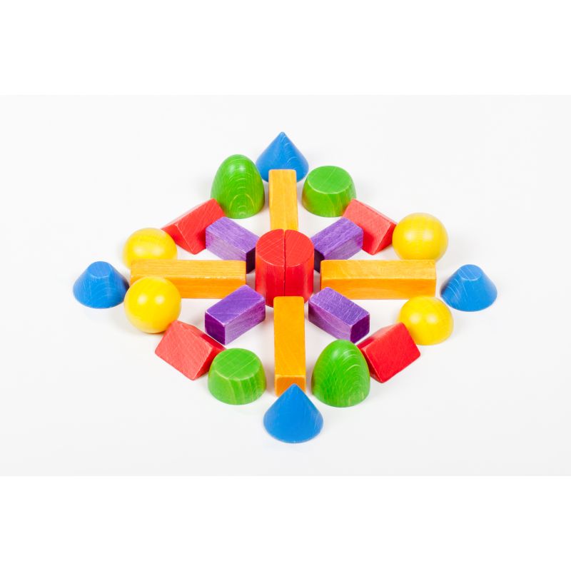 „Ist das Bauen mit Fröbel Spielmaterial noch zeitgemäss?“ Genau dieser Frage haben wir uns angenommen mit dem Ziel eine moderne Baustein-Sortierung zu konzeptionieren, die sowohl dem streng mathematischen Leitbild der Fröbelpädagogik folgt, als auch das freie künstlerische Denken und Gestalten fördert. Ergebnis unserer Entwicklung ist dieses Bauspiel, bestehend aus den klassischen Fröbel-Grundkörpern Kugel, Walze, Würfel und deren Teilungen ergänzt durch: Scheibe, Halbkugel, Kegel, Kegelstumpf, Paraboloid und Paraboloidstumpf. Neben dem freien Bauen können die Kleinen auch exakt nach Raster gestalten und planen. Dabei dient die mitgelieferte Rasterfolie als Kopiervorlage. Gerade bei dieser Spielvariante lernen Kinder die mathematischen Bezüge der einzelnen Körper zueinander besser zu verstehen.