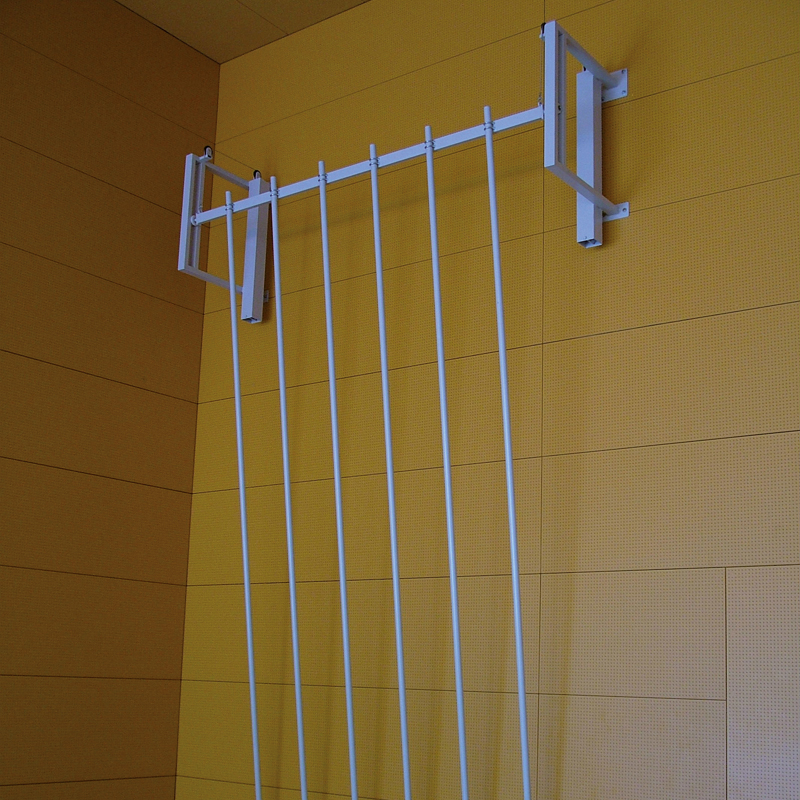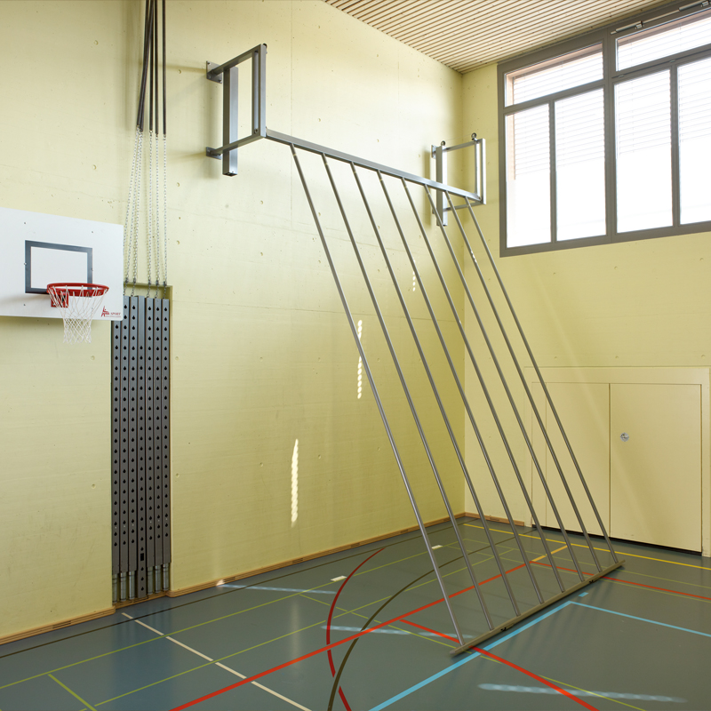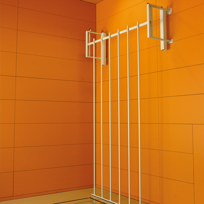 Stangen aus Stahlrohr Ø 42mm, zum Klettern senkrecht oder schräg nach vorn rollbar. Versorgt werden die Kletterstangen schräg nach hinten an die Wand. Bodentraverse auf Kunststoffwalzen laufend. Bodenschalen aus Kunststoff für senkrechte Stellung der Stangen. Wandkonsolen mit