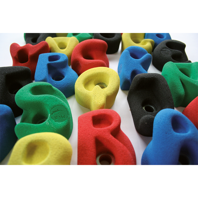 26 Kinderklettergriffe, massgeschneidert auf die besonderen ergonomischen Anforderungen von Kinderhänden. Auf den 26 Griffen sind jeweils Buchstaben herausgemeisselt. Dadurch haben Kinder und Lehrer eine Vielzahl von Möglichkeiten im spielerischen und pädagogischen Umgang mit der Kletter-/Boulderwand.