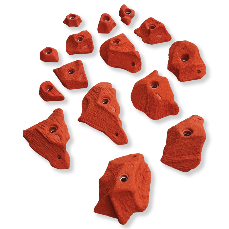 Klettergriffe aus hochwertigem UP und Quarzsand (Polyesterharze). Die Griffe enthalten einen Bruchschutzdraht, der im Falle eines Bruches verhindern soll, dass einzelne Bruchstücke des Griffes auseinanderfallen, mit zusätzlicher Verdrehsicherung.