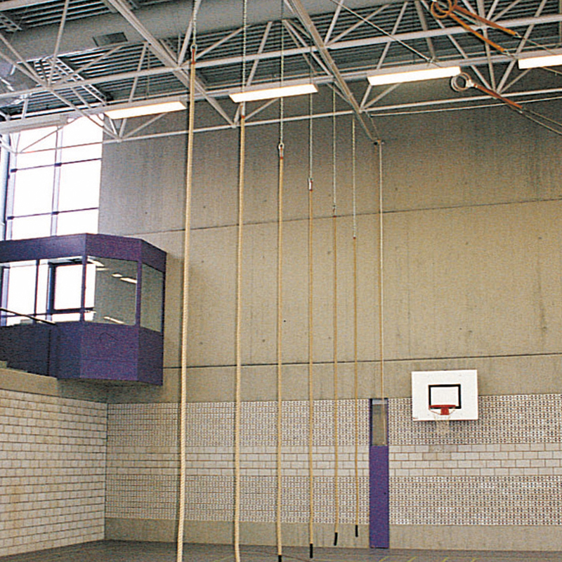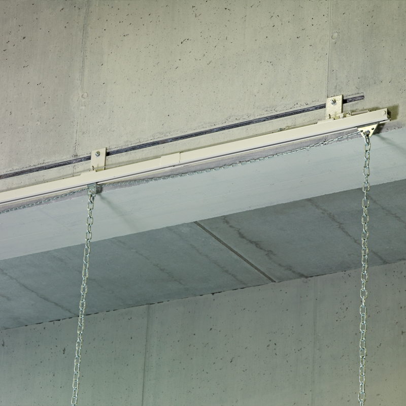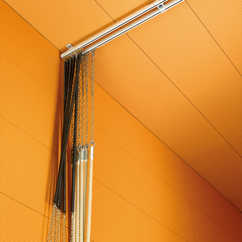 Tau aus Hanf Ø 33mm mit Kunststoffende an wartungsfreier Laufrolle angehängt. Deckenlaufschiene aus Stahlblech, am Ende mit Klinkenarretierung zur Fixierung der Taue. Seitlicher Wandhalter für Taue mit Befestigung von Entriegelungsseil. Deckenschiene mit Kurve bis zu 90° möglich.
