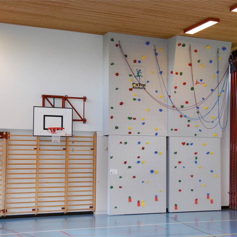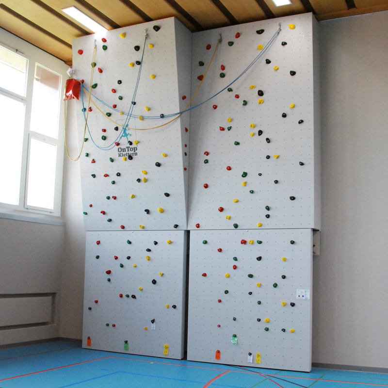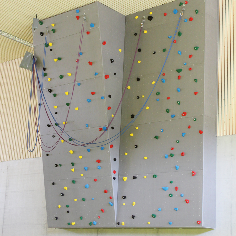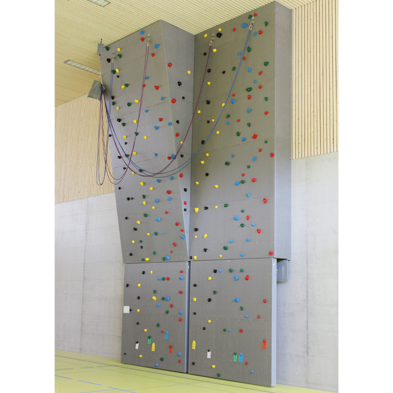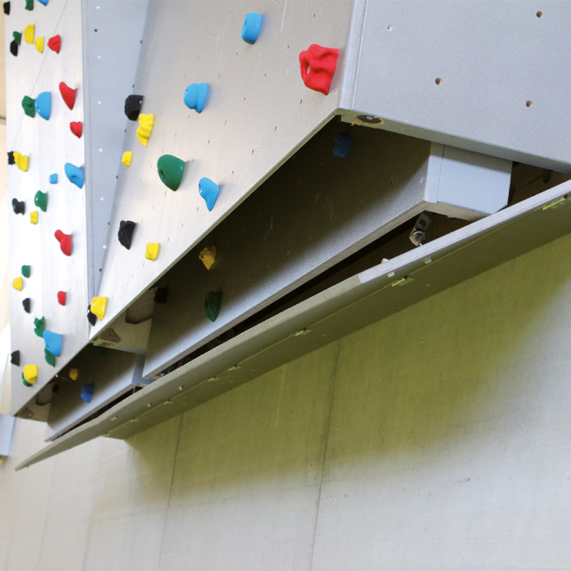 System-Kletteranlage mit jeweils einem senkrechten und einem überhängenden Bereich und zwei nach innen elektromotorisch hochziehbaren Kletterflächen. Ausstattung mit Paneelensystem, 4 Top-Rope-Umlenkungen und 4 Seilen. (bxh) 496 x 700 cm.