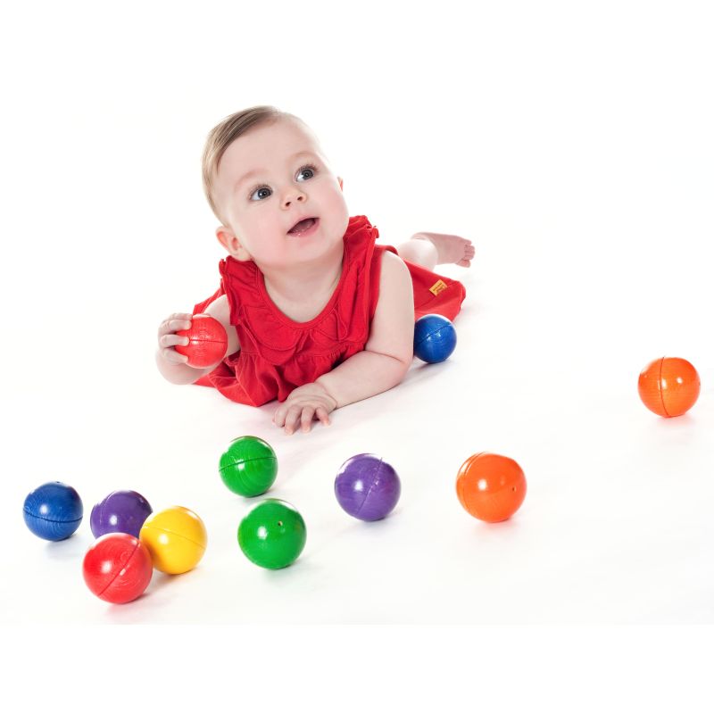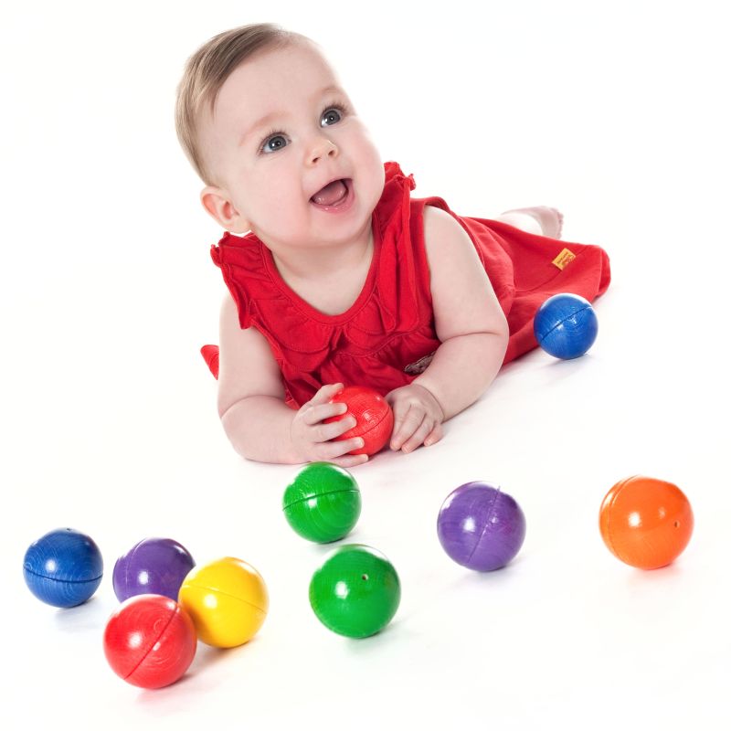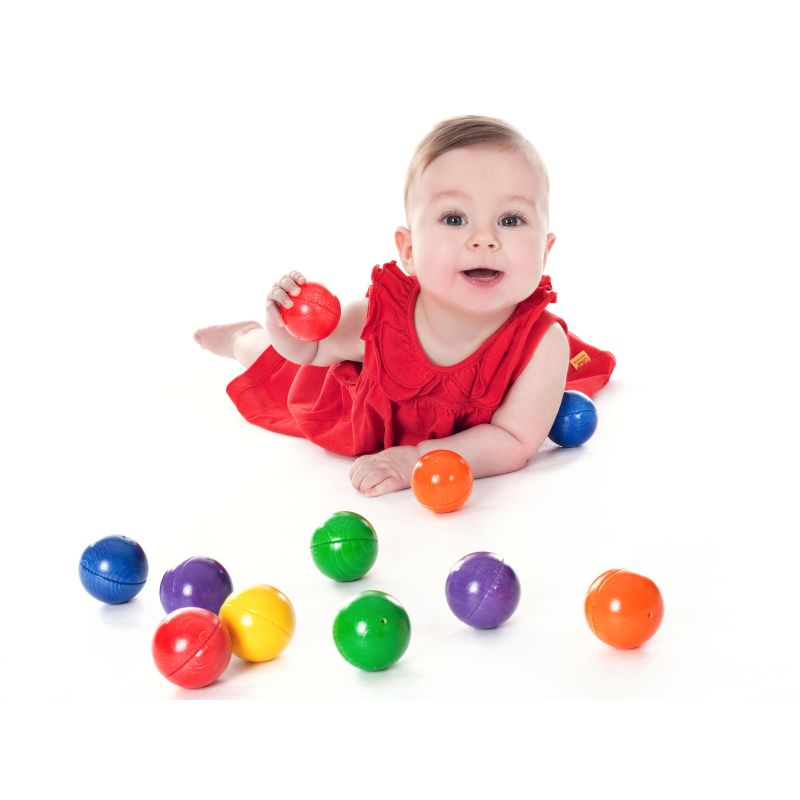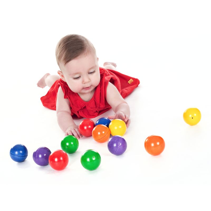 Die 12 Buchenholzkugeln in 6 leuchtenden Farbpaaren wecken die Neugier und Wahrnehmung beim Schütteln und Hören sowie beim Zuordnen von Klängen und Farben. Kinder krabbeln umher und rollen die Kugeln weiter. Somit werden Mobilität, Bewegung und grobmotorische Koordination unterstützt. Eltern regen das Kind zur Aufmerksamkeit an, wie z.B.: „Hör mal…“, „Schau mal genau hin…“. Das fördert die Kommunikation zwischen Eltern und Kindern, auch nach dem Spiel beim Einräumen der Kugeln in das Stoffsäckchen.