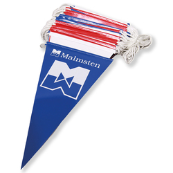 Rückenschwimm-Wimpelkette nach FINA-Norm. Wimpelkette an einer Nylonschnur mit abwechselnden drei Fahnen je Meter Seil. Langlebig, einfach zu bedienen und nach internationalen Regeln. Hergestellt aus dreieckig geformtem Vinylgewebe, das an einem Nylonseil befestigt (genäht) ist, von denen keines unnötig Wasser aufnimmt. Alle blauen Flaggen mit Malmsten-Logo.