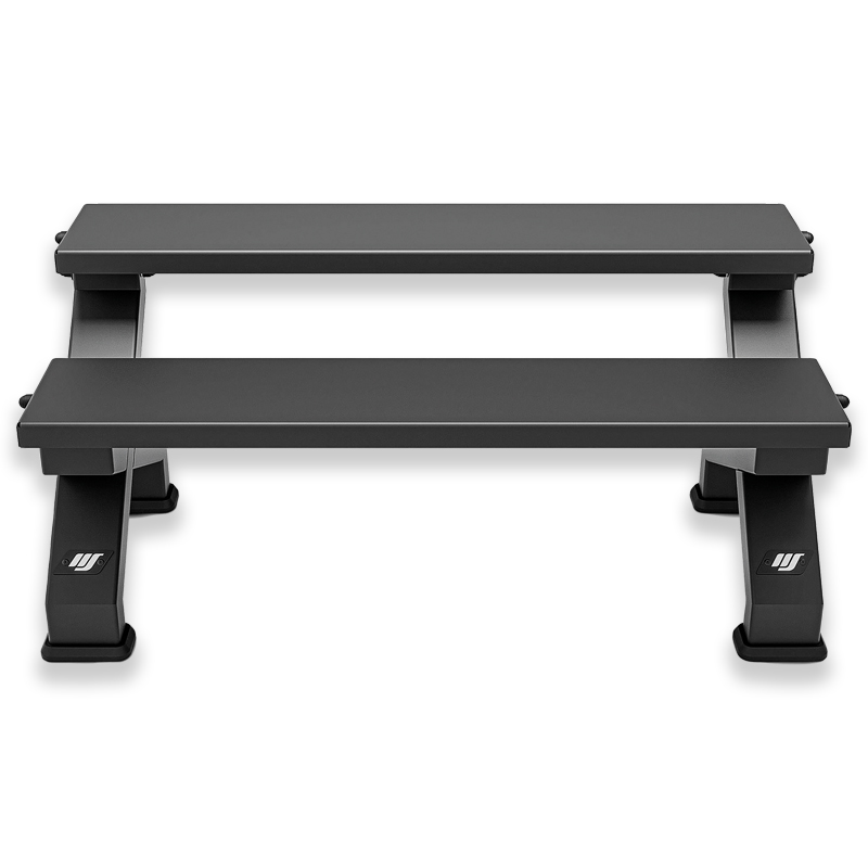 Kompakter und robuster Kettlebellständer mit einer maximalen Belastbarkeit von 300 kg. Je nach Grösse und Gewicht der Kettlebells können bis zu 6 je Ablageebene gelagert werden.