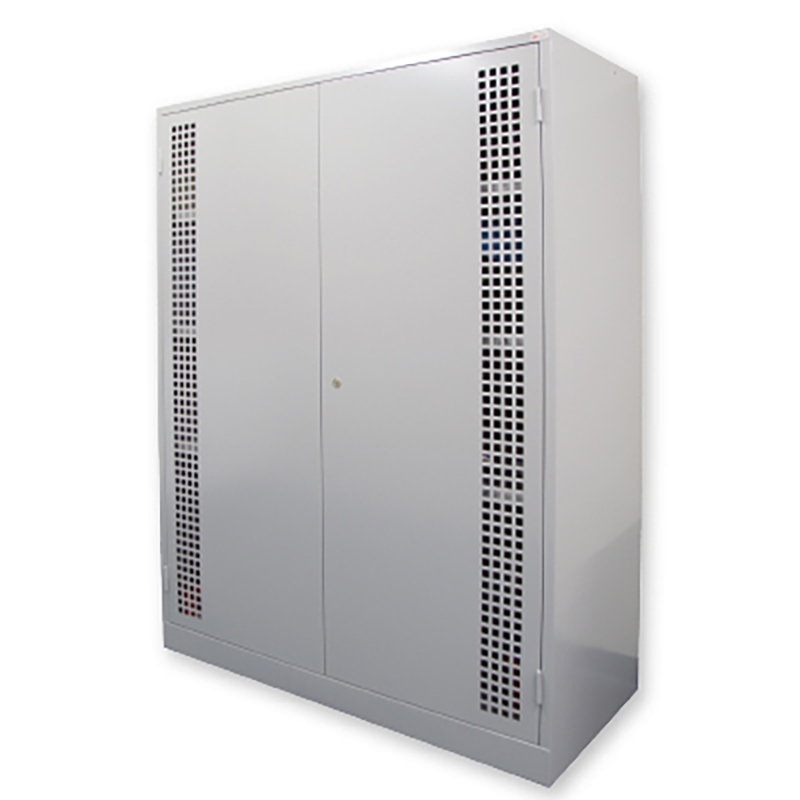 pulverbeschichtet in RAL 7035, Lichtgrau. Inneneinrichtung mit verstellbaren Tablaren, vorne mit Abrollrand damit die Bälle nicht herunterfallen. Ausführung mit Vollblechtüren oder mit zentraler Teilperforation (bxh) 270 x 1620 mm, 4-kt 20 mm. Türen mit vertikalen Verstärkungsrippen innen. Dreipunkt-Stangenverschluss, versenkter Drehgriff aus Kunststoff mit integriertem Zylinderschloss mit 2 Schlüsseln.