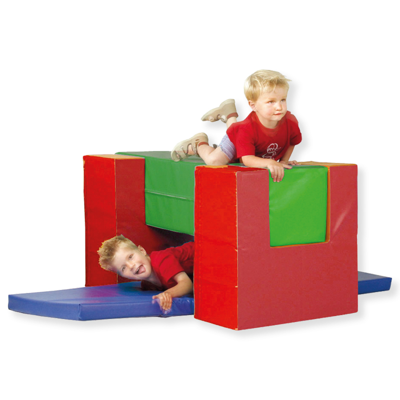 Überzüge aus Turnmattenstoff, strapazierfähig, reissfest, profiliert für hohe Rutschfestigkeit, hygienisch, abwaschbar, Einlagen aus festem elastischen Polyether-Schaumstoff, FCKW-frei.