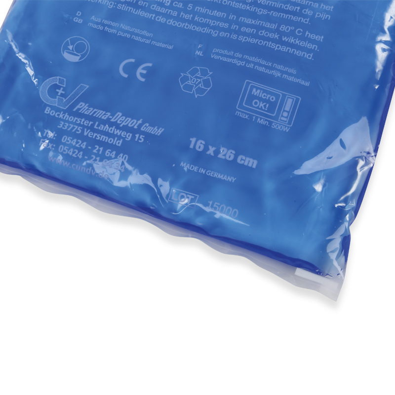 Kalt Anwendung: Die Kompresse wird für 2 Stunden in das Gefrierfach oder die Tiefkühltruhe gelegt. Vor dem Auflegen auf die Haut, sollte die Kompresse in ein Tuch eingewickelt werden.