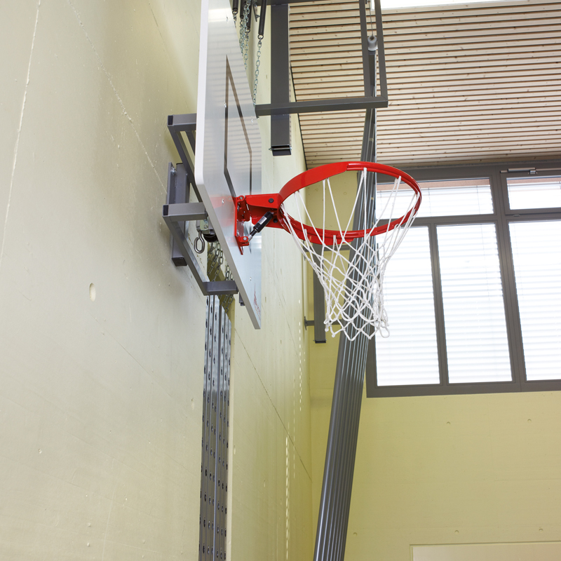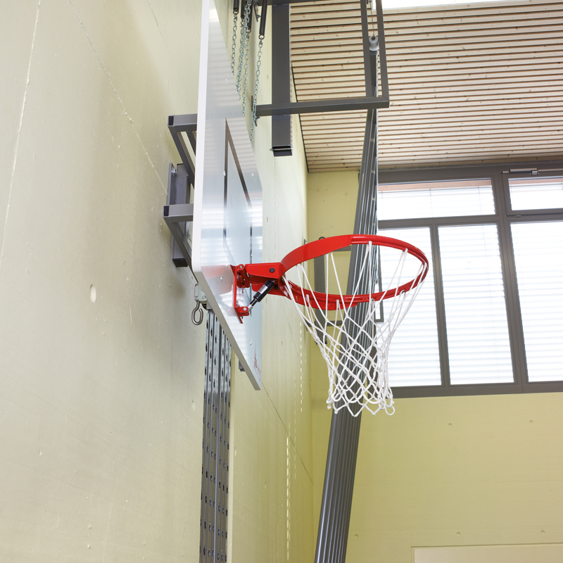Brett 120 x 90cm aus MDF oder Acrylglas auf Stahlrohrrahmen, nach Vorschrift markiert. Korbhöhe mit Kurbelgetriebe von 260 bis 305cm stufenlos verstellbar.