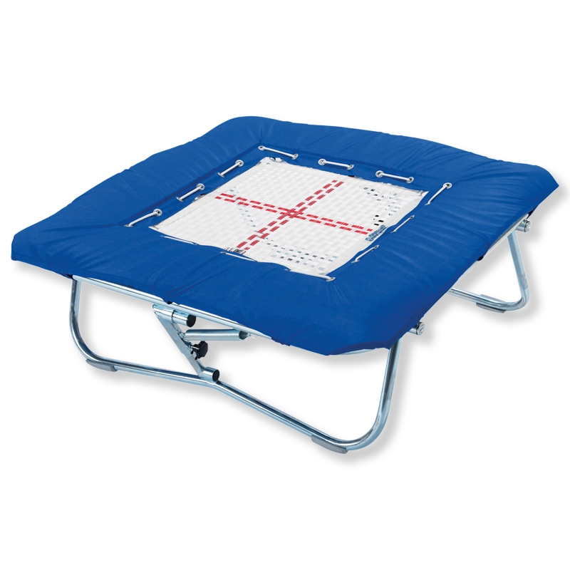 Schräge und Höhe verstellbar. Rahmen 112 x 112 cm, Sprungtuch 60 x 60 cm mit Stahlfedern. Komplett mit Randabdeckung.