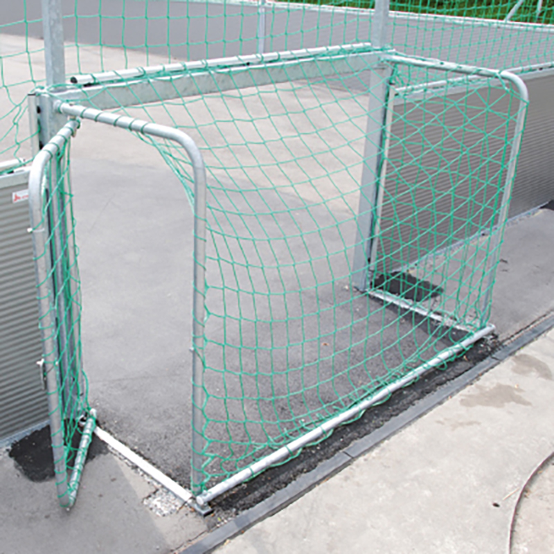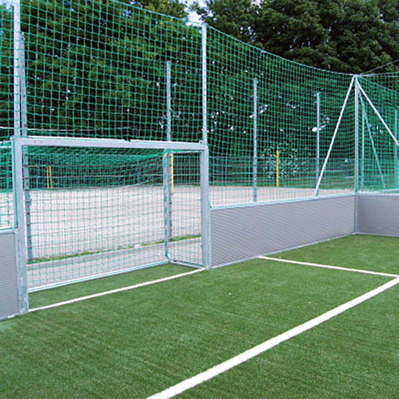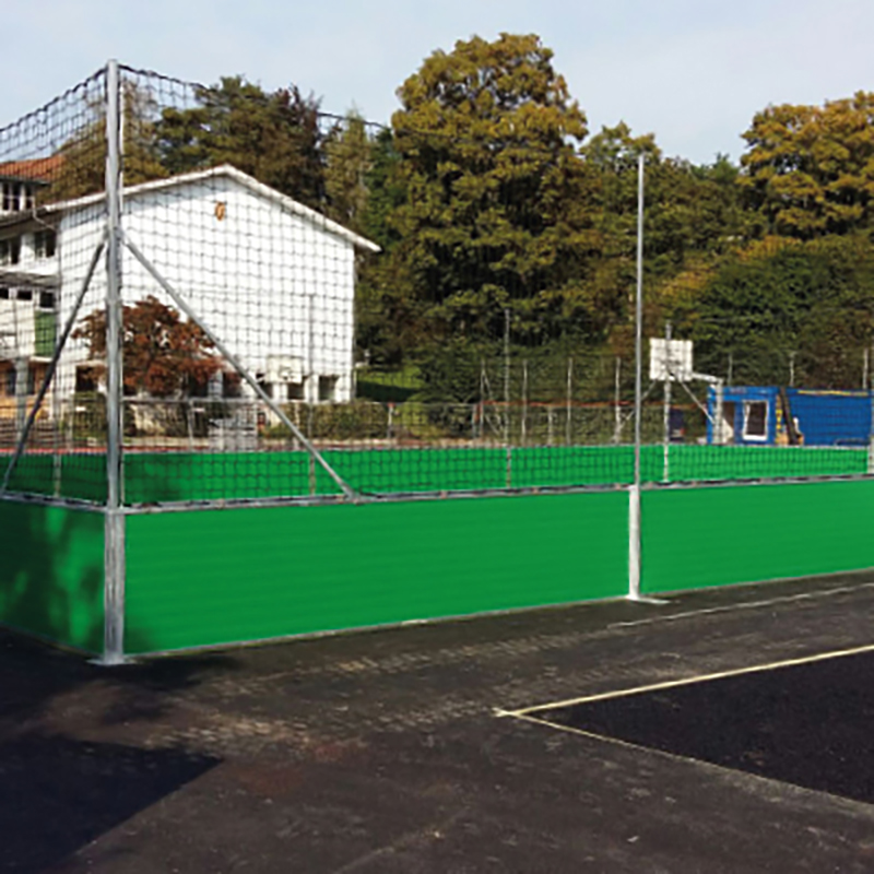 40 mm starke, wetterfeste Sandwich-Bandenelemente aus PU-Hartschaum mit Stahlschale 0.75 mm. Verbindungs- und Toranbauelemente aus Stahlrohr, feuerverzinkt mit integrierter Aufnahme für die Netzpfosten. Netzhöhe 4m über Boden. Aluminiumtor 180 x 120 cm oder 300 x 200 cm mit Netzbüglen aus Stahlrohr, feuerverzinkt.