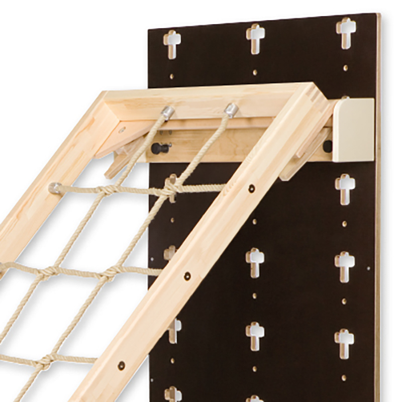 Unser Allroundtalent der Multi-Adapter ist eine einzelne Holzsprosse, die sich zum Einhängen von Kletternetz, Rutsche oder Leiter eignet und auch als Haltestange verwendet werden kann. Durch die Höhenverstellbarkeit eignet sie sich als vollständiger Ersatz einer Sprossenwand.