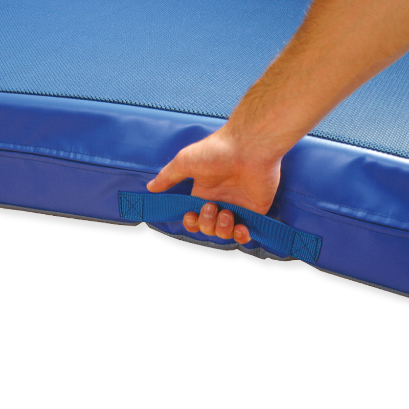 Oberteil aus luftdurchlässigem Gittergewebe, unten mit Gleitschutz, 4 enganliegende Traggriffe, längs und quer mit angenähtem Verbindungslappen.