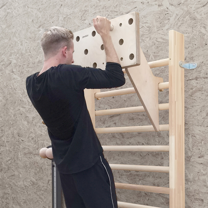 Mithilfe des Adapters können Sie das pedalo® Kletter-Trainingsboard ganz einfach an eine Sprossenwand einhängen.
