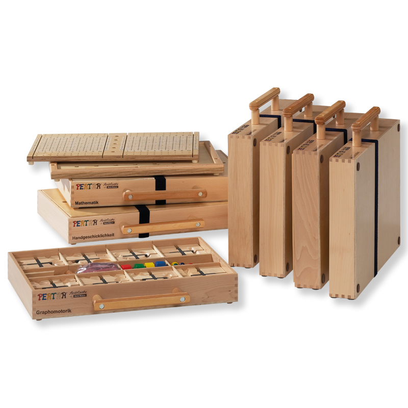 Aufbewahrungshilfe für die 7 Pertra® Koffer. Material aus Holz mit feststellbaren Rollen.