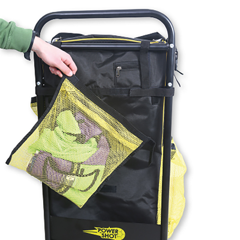 Der Powershot® Gerätewagen macht den Trainingsalltag für Fussballspieler und -Trainer um einiges einfacher. Es können über 20 Bälle und zusätzliches Equipment spielend leicht transportiert werden. Seitlich befinden sich Riemen für Koordinationsreifen sowie ein Netz für Markierscheiben. Auf der anderen Seite finden bis zu 15 Slalomstangen und zwei Koordinationsleiter Platz. Ausserdem enthält der Wagen ein waschbares, abnehmbares Netz für benutze Trainingsleibchen, welches ausserdem aus recyceltem Material besteht. Die Leibchen können nach dem Training mitsamt dem Netz in die Waschmaschine geworfen werden. Zudem ist oben im Gerätewagen in einer Reissverschlusstasche eine 2-seitige Taktiktafel mit ganzem und halbem Spielfeld integriert. Die stabilen und griffigen Rollen machen den Wagen auf jedem Untergrund einsatzfähig. Die verstärkte Basis des Gerätewagens verleiht besondere Stailität. Er passt mit runtergeklappten Sitzen in ein kleines Familienauto.