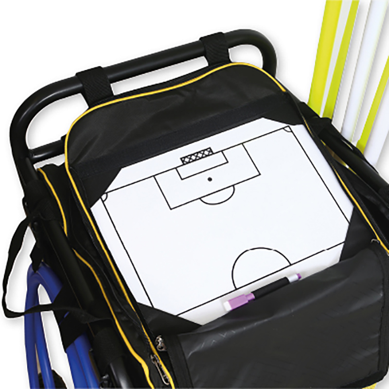 - Zusätzliche Fächer: Oben Taktiktafel, Seitlich jeweils Netze und Riemen für Equipment, Abnehmbares Wäschenetz für Trainingsleibchen aus recyceltem Material