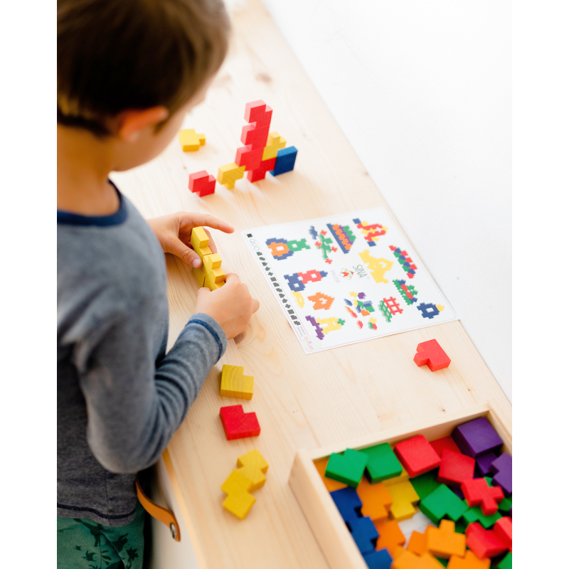 216 Hartholzbausteine (Grundmass 37,5 x 37,5 x 12,5 mm) in sechs verschiedenen Formen und Farben, Bauanleitung.