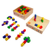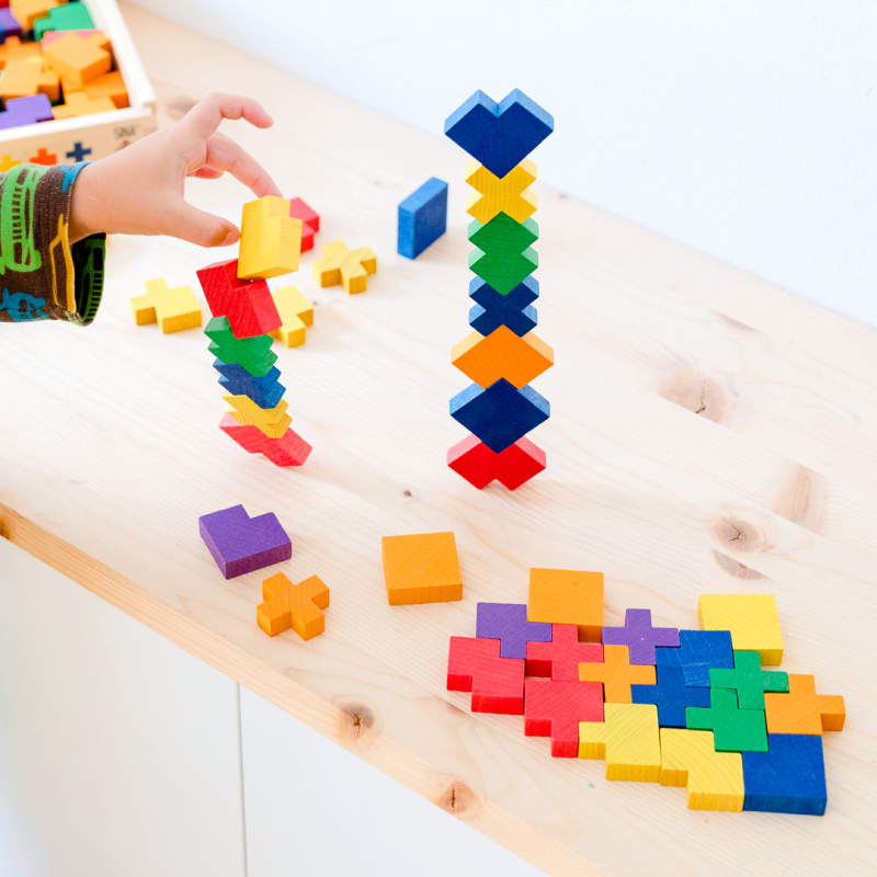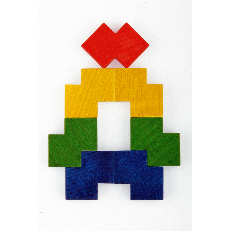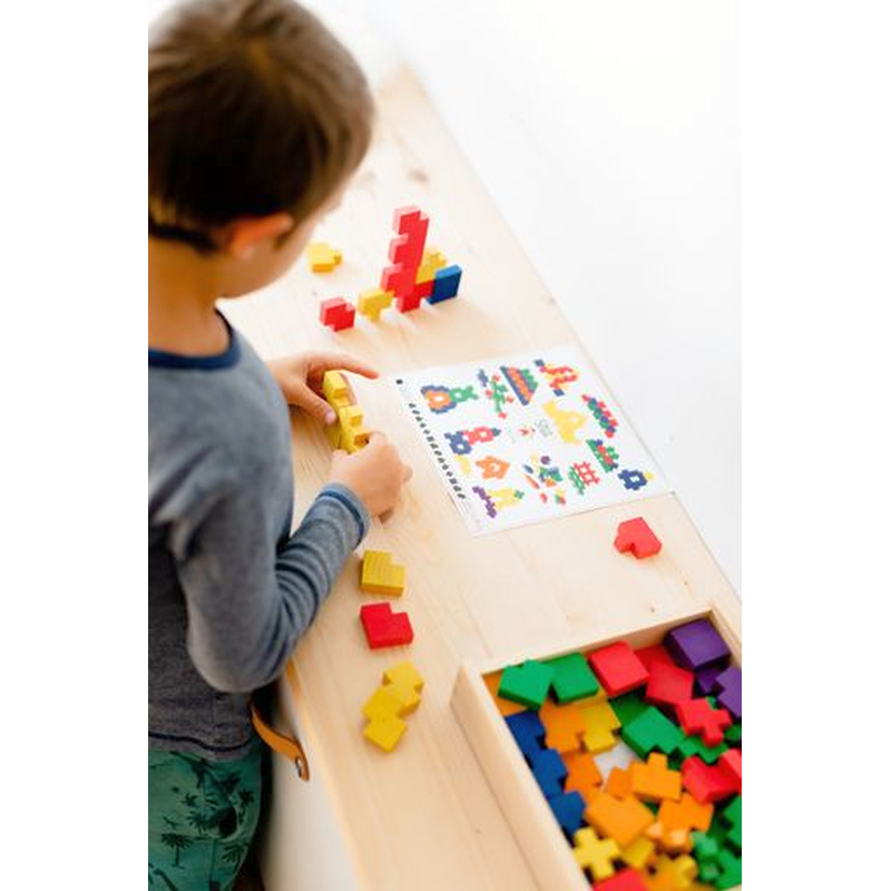 108 Hartholzbausteine (Grundmass 37,5 x 37,5 x 12,5 mm) in sechs verschiedenen Formen und Farben, Bauanleitung.