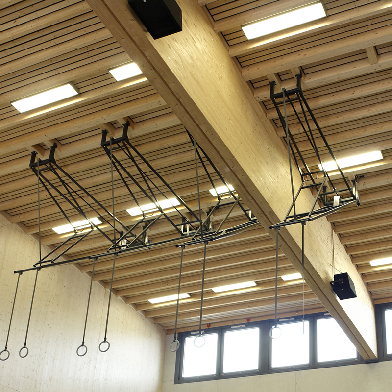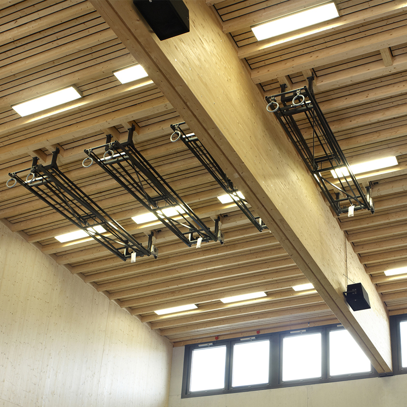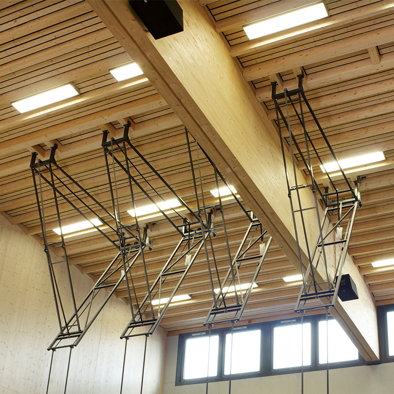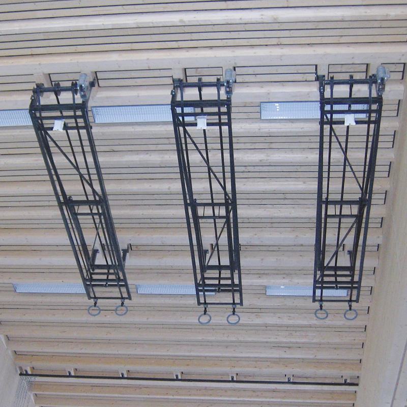 Gummiringe mit Stahlkern, an Gurten befestigt, die mit einem Elektromotor 230V hochgezogen werden. Einzelklapprahmen mit Stabilisierungsschere zum Absenken der Pendelpunkte auf 550 bis 600cm. Der Antrieb des Einzelklapprahmens erfolgt mit einem Elektromotor 230V, mit 2 eingebauten Endschaltern.