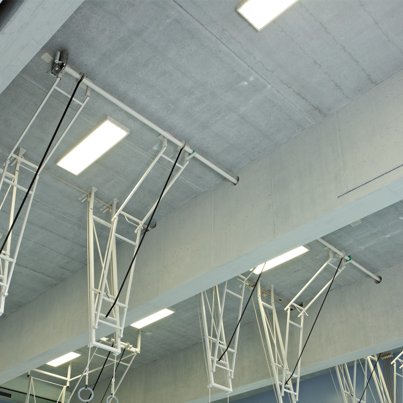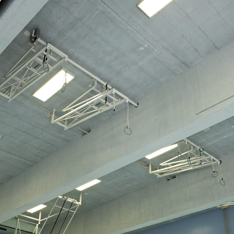 Gummirine mit Stahlkern an Schwungseilen aus Hanf, Endseile aus Polypropylen, stahlarmiert. Umlenkrolle und seitliches Sicherheitsschloss mit Einzeldornsicherung. Einzelklapprahmen mit Stabilisierungsschere zum Absenken der Pendelpunkte auf 550 bis 600cm. Der Antrieb des Einzelklapprahmens erfolgt mit einem Elektromotor 230V, mit 2 eingebauten Endschaltern.