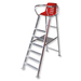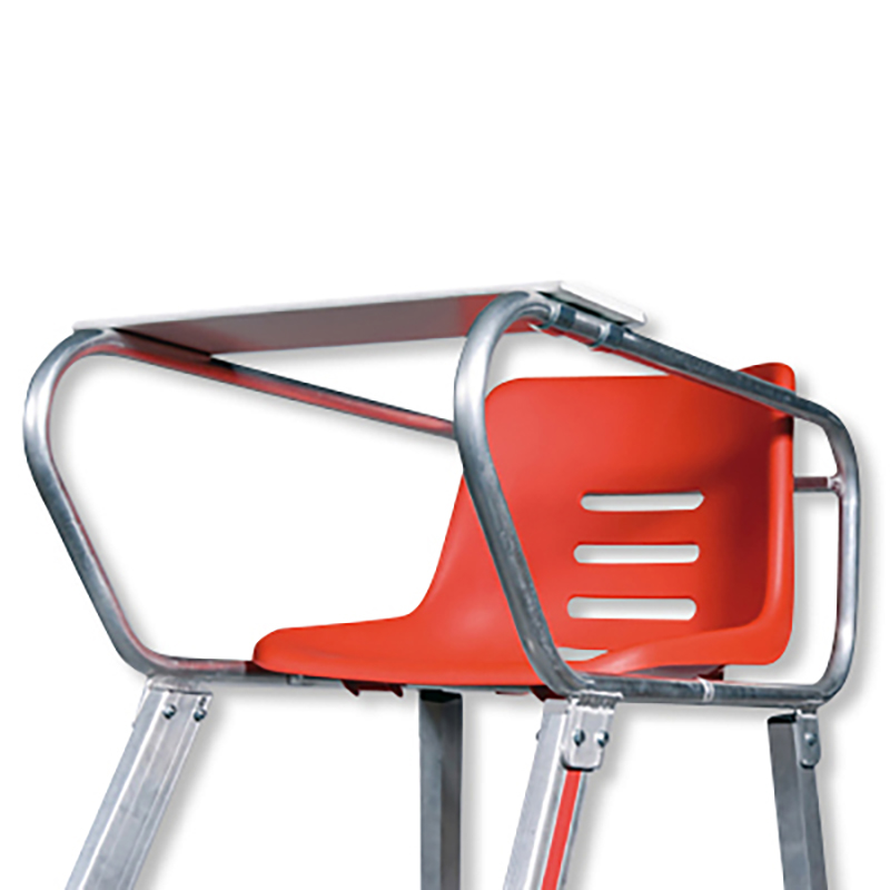 Extra breite wetterfeste Aluminium-Konstruktion, mit rutschsicher profilierten Stufen. Schalensitz für bequemes Sitzen, klappbarem Schreibbrett und praktischer Mittelablage.