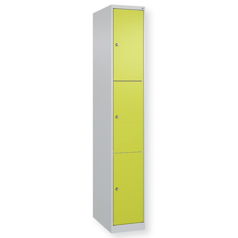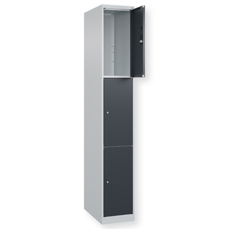 Schliessfachschrank Classic PLUS, 1 Abteil mit 3 Fächern, Abteilbreite 300 mm, Korpus aus stabiler Stahlkonstruktion mit hochwertiger Einbrennbeschichtung für hohe UV- und Korrosionsbeständigkeit, mit Bodengleitern als praktischer Schrank- und Fussbodenschutz, Türöffnungen 110 Grad, Türaufhängung rechts, Stahl-Türen mit Soft-Anschlag und geschlossenen Seitenprofilen für hohe Stabilität, Türaufhängung in stabilen Drehbolzen, 3 Zylinderschlösser mit 2 Schlüsseln, Schliesskreis bis 1000 verschiedene Schliessungen.
