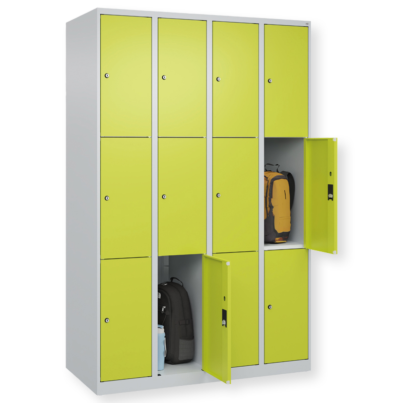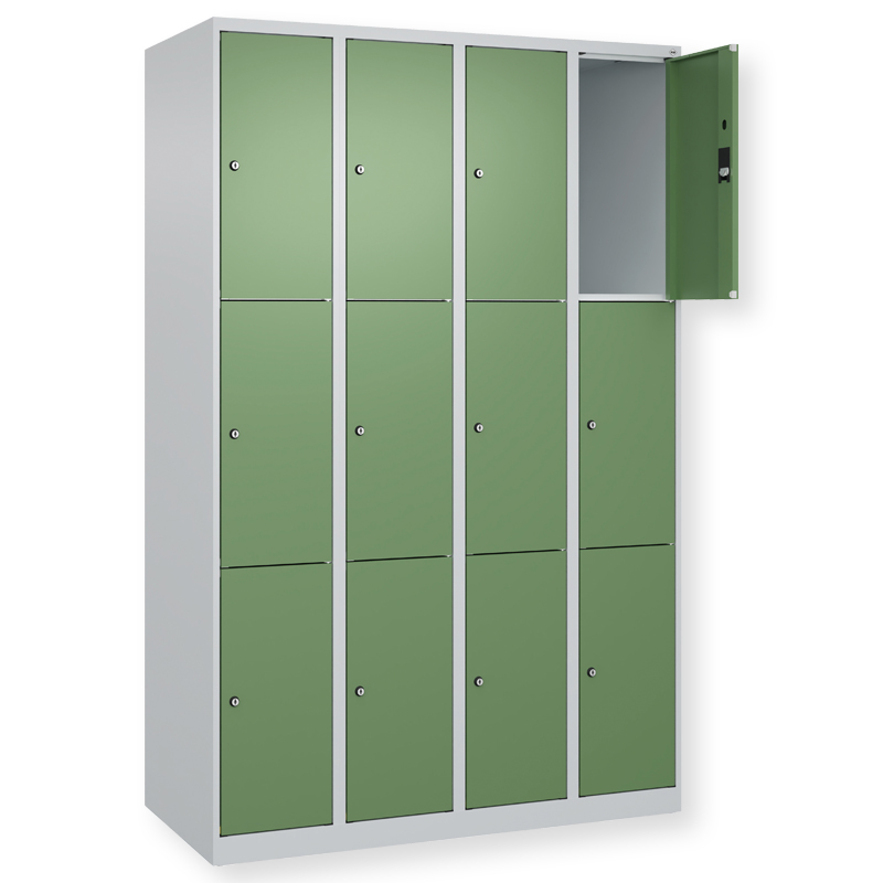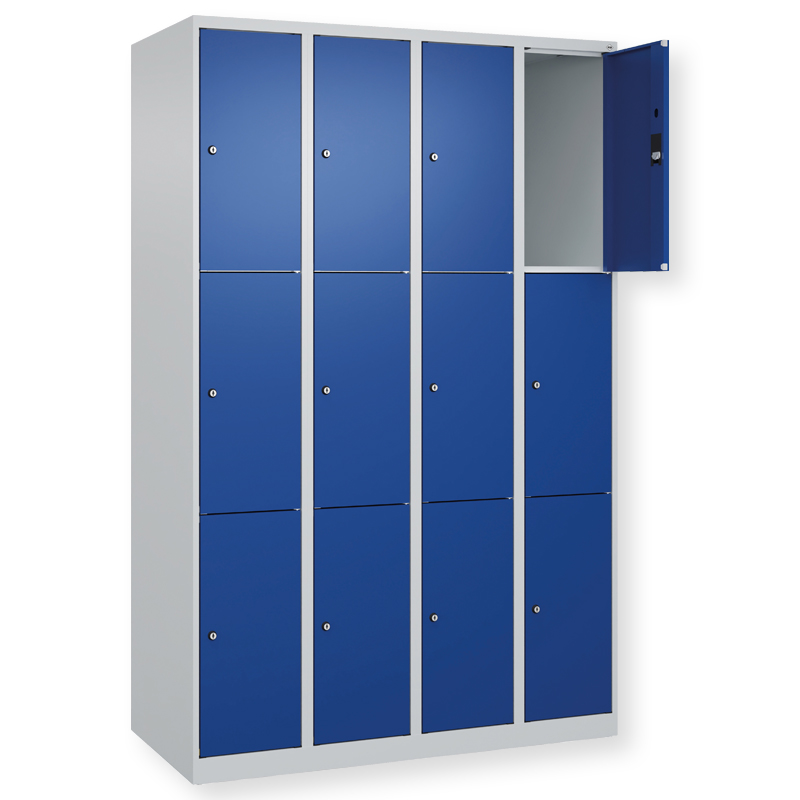 Schliessfachschrank Classic PLUS, 1 Abteil mit 3 Fächern, Abteilbreite 300 mm, Korpus aus stabiler Stahlkonstruktion mit hochwertiger Einbrennbeschichtung für hohe UV- und Korrosionsbeständigkeit, mit Bodengleitern als praktischer Schrank- und Fussbodenschutz, Türöffnungen 110 Grad, Türaufhängung rechts, Stahl-Türen mit Soft-Anschlag und geschlossenen Seitenprofilen für hohe Stabilität, Türaufhängung in stabilen Drehbolzen, 3 Zylinderschlösser mit 2 Schlüsseln, Schliesskreis bis 1000 verschiedene Schliessungen.