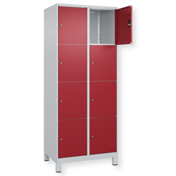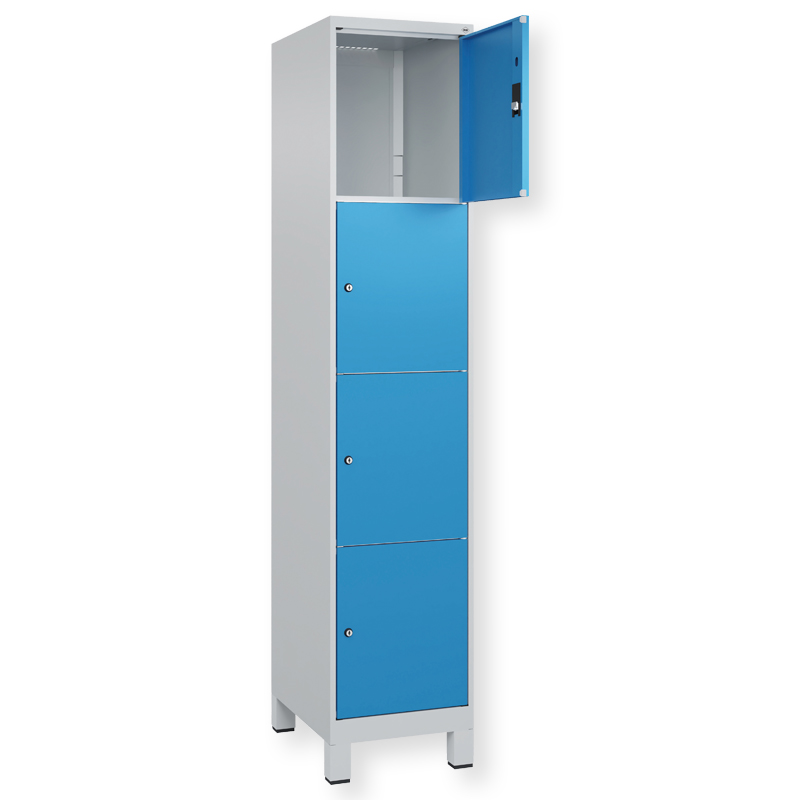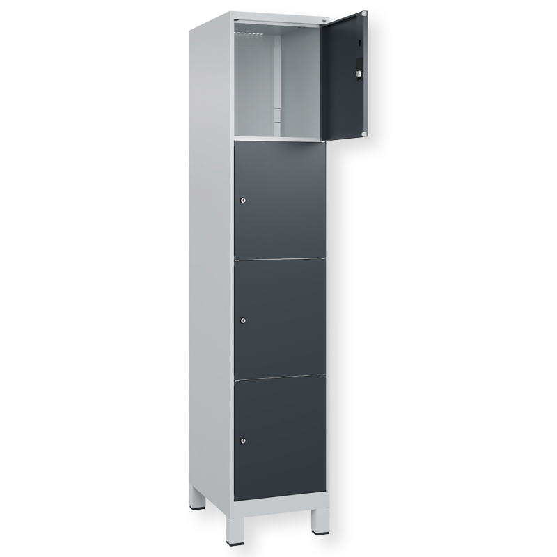 Schliessfachschrank Classic PLUS, 1 Abteil mit 4 Fächern, Abteilbreite 400 mm, Korpus aus stabiler Stahlkonstruktion mit hochwertiger Einbrennbeschichtung für hohe UV- und Korrosionsbeständigkeit, Türöffnungen 110 Grad, Türaufhängung rechts, Stahl-Türen mit Soft-Anschlag und geschlossenen Seitenprofilen für hohe Stabilität, Türaufhängung in stabilen Drehbolzen, 4 Zylinderschlösser mit 2 Schlüsseln, Schliesskreis bis 1000 verschiedene Schliessungen, 100 mm hohe Füsse aus Kunststoff für erweiterten Korrosionsschutz.