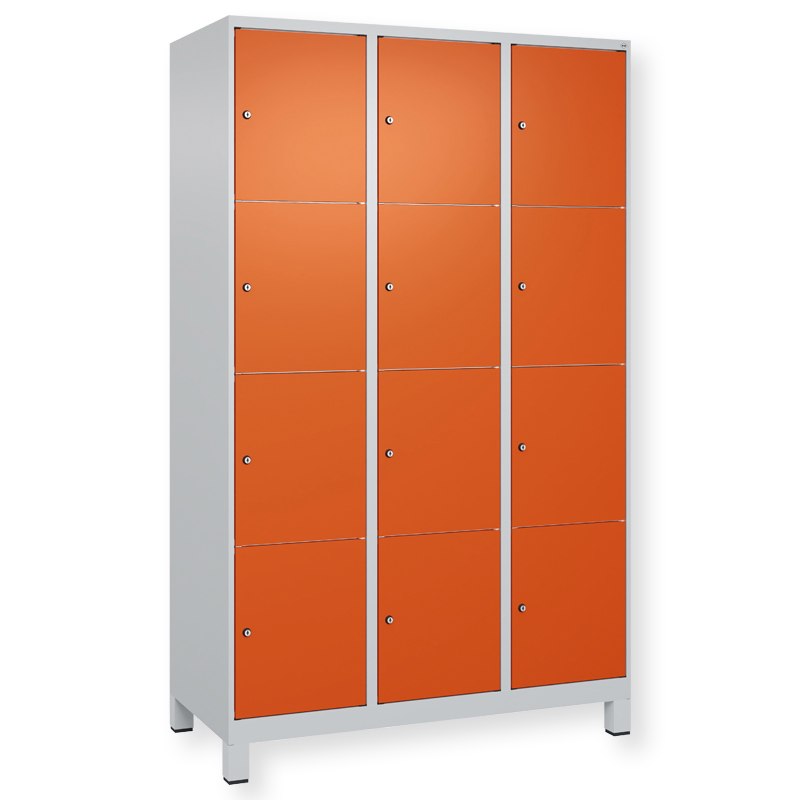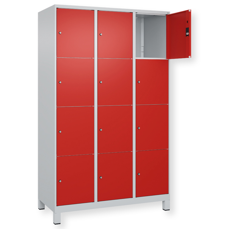 Schliessfachschrank Classic PLUS, 1 Abteil mit 4 Fächern, Abteilbreite 400 mm, Korpus aus stabiler Stahlkonstruktion mit hochwertiger Einbrennbeschichtung für hohe UV- und Korrosionsbeständigkeit, Türöffnungen 110 Grad, Türaufhängung rechts, Stahl-Türen mit Soft-Anschlag und geschlossenen Seitenprofilen für hohe Stabilität, Türaufhängung in stabilen Drehbolzen, 4 Zylinderschlösser mit 2 Schlüsseln, Schliesskreis bis 1000 verschiedene Schliessungen, 100 mm hohe Füsse aus Kunststoff für erweiterten Korrosionsschutz.