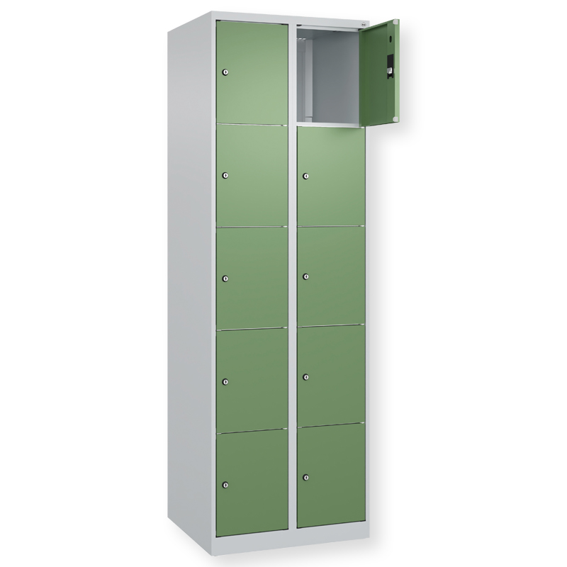 Schliessfachschrank Classic PLUS, 1 Abteil mit 5 Fächern, Abteilbreite 300 mm, Korpus aus stabiler Stahlkonstruktion mit hochwertiger Einbrennbeschichtung für hohe UV- und Korrosionsbeständigkeit, mit Bodengleitern als praktischer Schrank- und Fussbodenschutz, Türöffnungen 110 Grad, Türaufhängung rechts, Stahl-Türen mit Soft-Anschlag und geschlossenen Seitenprofilen für hohe Stabilität, Türaufhängung in stabilen Drehbolzen, 5 Zylinderschlösser mit 2 Schlüsseln, Schliesskreis bis 1000 verschiedene Schliessungen.