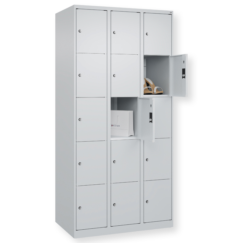 Schliessfachschrank Classic PLUS, 1 Abteil mit 5 Fächern, Abteilbreite 300 mm, Korpus aus stabiler Stahlkonstruktion mit hochwertiger Einbrennbeschichtung für hohe UV- und Korrosionsbeständigkeit, mit Bodengleitern als praktischer Schrank- und Fussbodenschutz, Türöffnungen 110 Grad, Türaufhängung rechts, Stahl-Türen mit Soft-Anschlag und geschlossenen Seitenprofilen für hohe Stabilität, Türaufhängung in stabilen Drehbolzen, 5 Zylinderschlösser mit 2 Schlüsseln, Schliesskreis bis 1000 verschiedene Schliessungen.