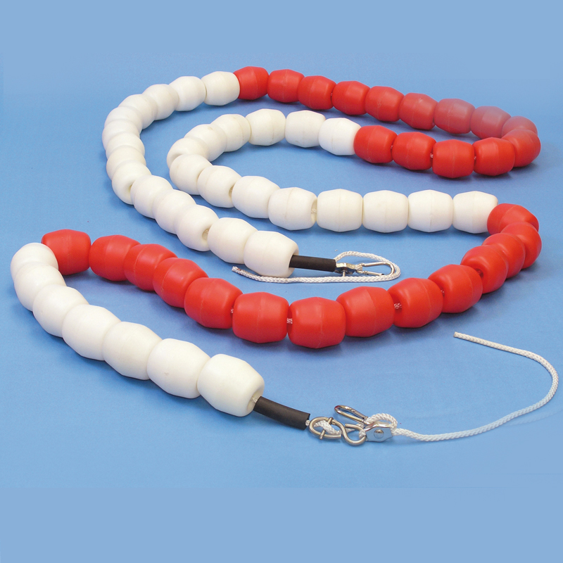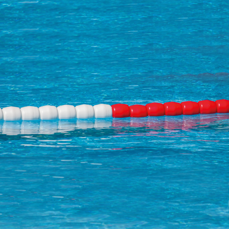 Schwimmleine mit Hostalen-Schwimmern (ca. 70 x 65 mm) dicht an dicht, ohne Abstand. Die Enden sind jeweils 5 Meter weit mit roten Hostalen-Schwimmern ausgestattet, dazwischen wechseln sich rot und weiss je Meter ab. Pro Meter liegen 14 Treiber auf der Leine. Die Schwimmleine besteht aus unverrottbarem, nicht dehnbarem und pflegefreiem Multion-Seil und ist mit rostfreien Stahl-Karabinerhaken, Simplexklemme und einer Stellacht ausgestattet. Trainingsleine gemäss FINA Vorschrift.