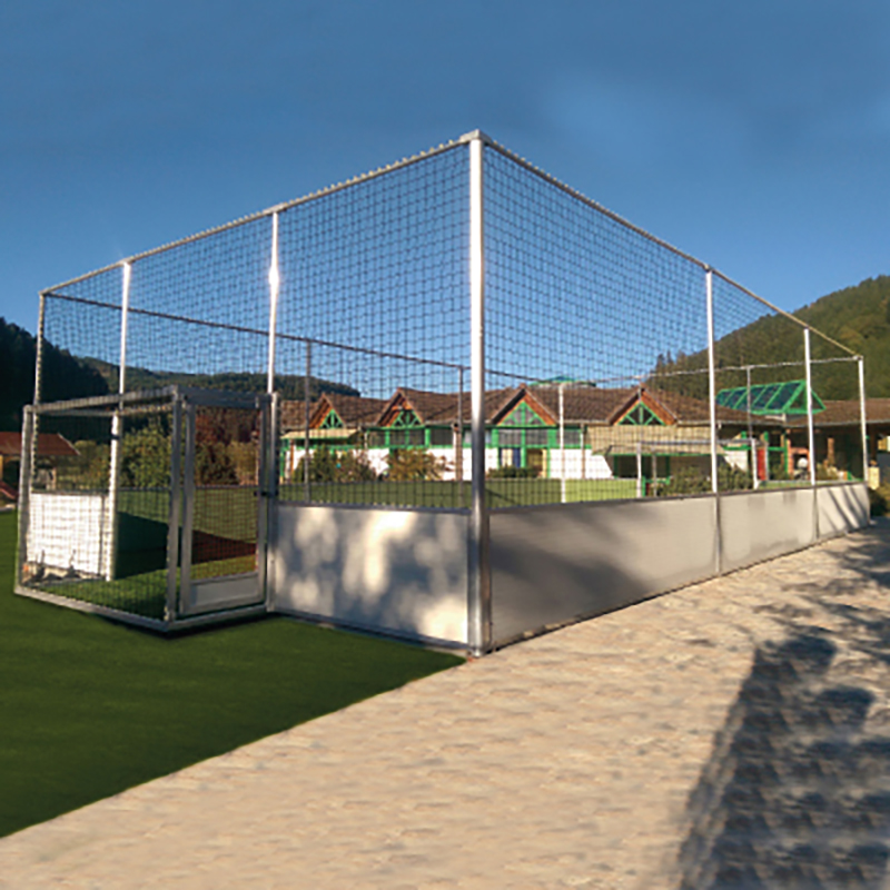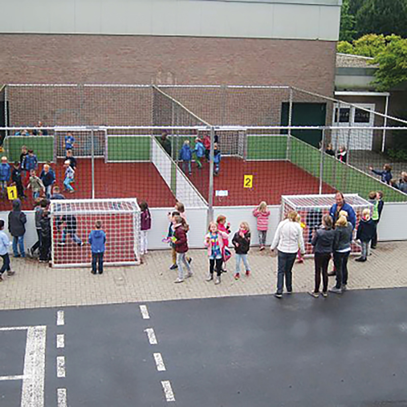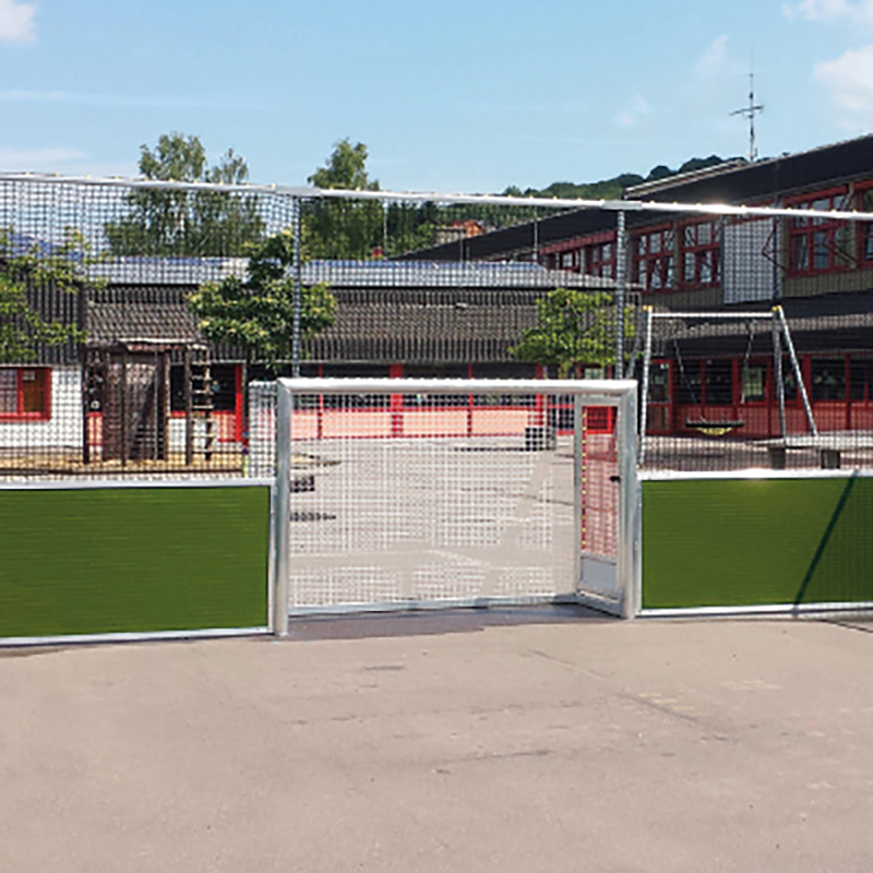 - Grundausstattung: Umlaufendes Bandensystem, 2 Fussballtore + Netze, 2 Zugangstüren + Netze