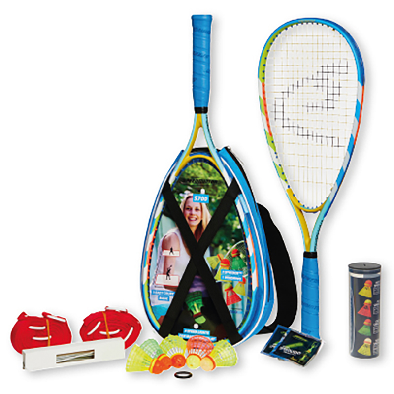 Das Speedminton S700 Set ist ein hervorragendes Allround-Set, dass inklusive eines transportablen Spielfeld, ganz nach dem Speedminton-Motto 'spielen Sie ohne Netz und Limits'. Neben den Spielfeldlinien, sind im Set 2 Speed Badminton Schläger aus gehärtetem Aluminium mit Mega-Power-Zone (MPZ) für noch mehr Schlagkraft enthalten.