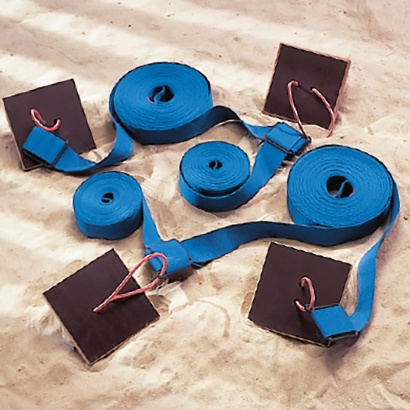 mit verstellbaren glasfaserverstärkten Kunststoff-Eckelementen (verstellbar auf 8 x 16 m), 50 mm breites Gurtband und Kennzeichnung in der Mitte. Komplett mit 4 Sandankerplatten und Bungee-Spannleinen.