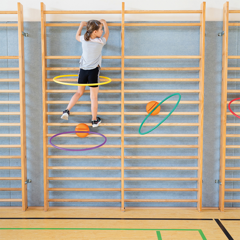 Gestalten Sie einen Kletterparcours in Ihrer Sporthalle mit dem WalliBari® Halterungs-Set. Die Halterungen sind für 8 mm dicke, flache Reifen oder 20 mm dicke, runde Reifen ausgelegt. Sie können an Sprossenwänden befestigt werden, die einen Abstand von mindestens 9 cm und höchstens 15 cm zwischen zwei Sprossen aufweisen. Das Set enthält 4 orangefarbene Halterungen.