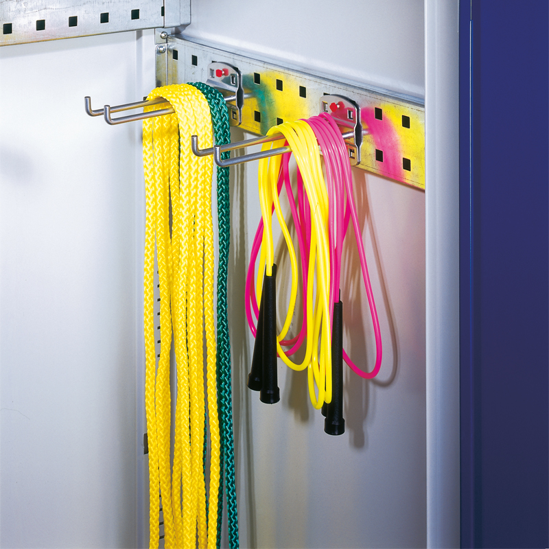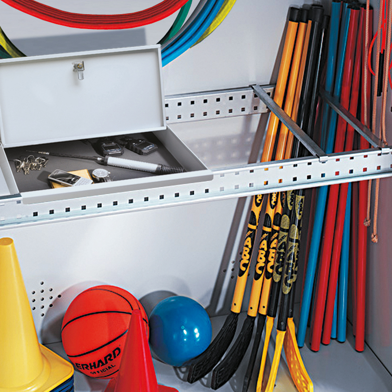 Inneneinrichtung mit verstellbaren Tablaren, vorne hochgekantet (Abrollschutz) oder mit Einbau für Kleingeräte wie Keulen, Reifen usw. sowie mit abschliessbarem Wertfach. Ausführung mit Vollblechtüren oder Lochblechtüren. Stangenverschluss mit Drehgriff mit integriertem Zylinderschloss mit 2 Schlüsseln. Korpus generell einbrennlackiert in RAL 7035, Lichtgrau. Türen einbrennlackiert nach Wahl. Türen sind in folgenden Farben lieferbar: Lichtgrau, RAL 7035, Enzianblau RAL 5010, Lichtblau RAL 5012, Rubinrot RAL 3003.