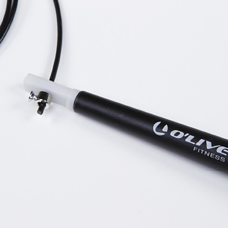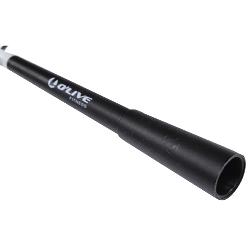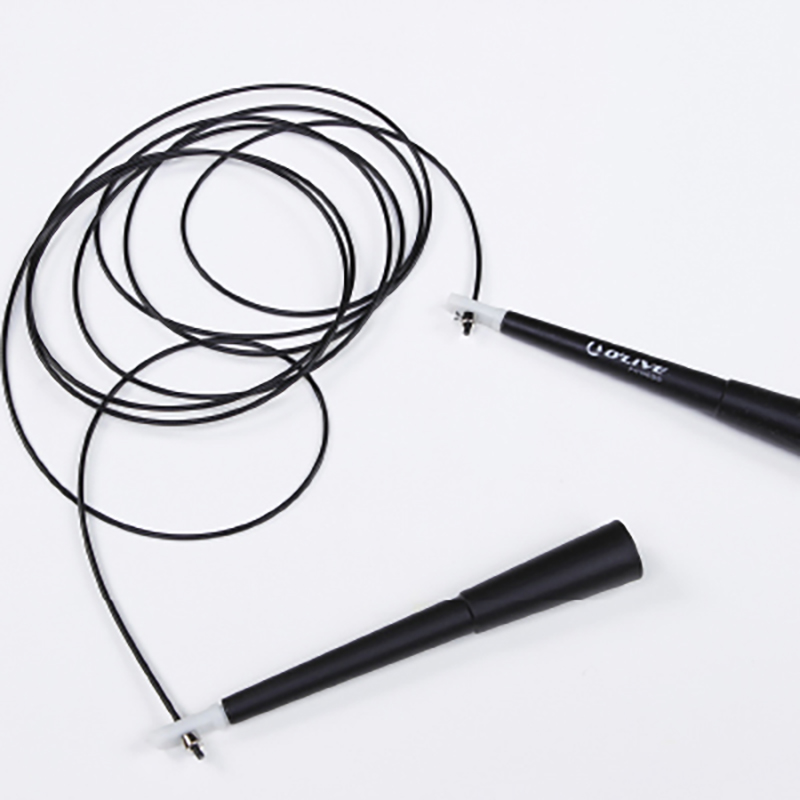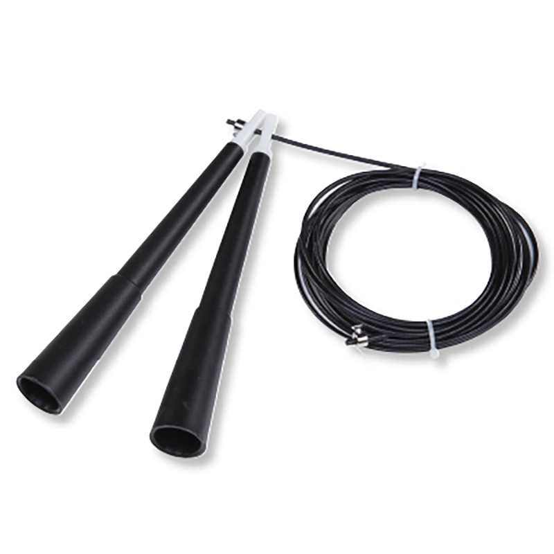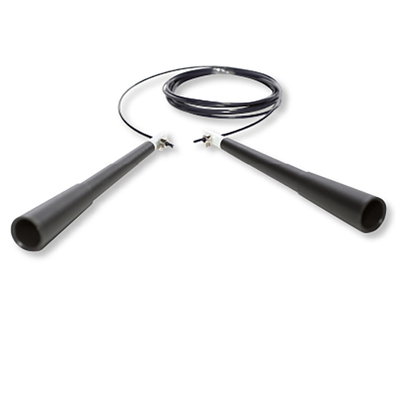 Leichtes, schnelldrehendes und haltbares Springseil. Griffe mit Metallstift zur Aufnahme des kunststoffummantelten Stahlseils.