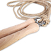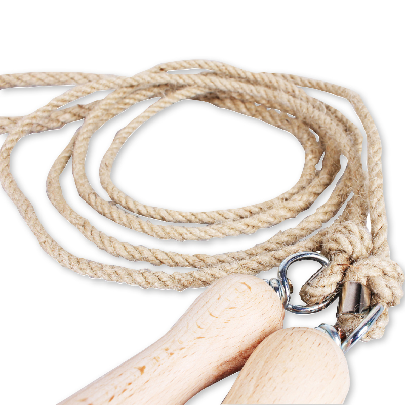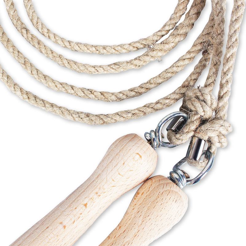 Das Springseil besteht aus 100 % Hanf mit Holzgriffen und Drehwirbel. Das Seil ist in der Mitte auf 1 cm verstärkt, die Seillänge ist mithilfe der Schlaufe unterhalb des Holz Griffes verstellbar. Die Holzgriffe sind naturfarben und lackiert.