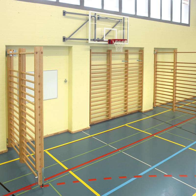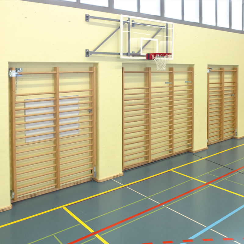 Sprossenwand aus Holz, ovale Sprossen aus mehrfach verleimtem Schichtholz, alle Holzteile farblos lackiert. Wandbeschläge aus Stahl, galvanisch verzinkt. (Auf Wunsch auch farbig lackiert möglich)
