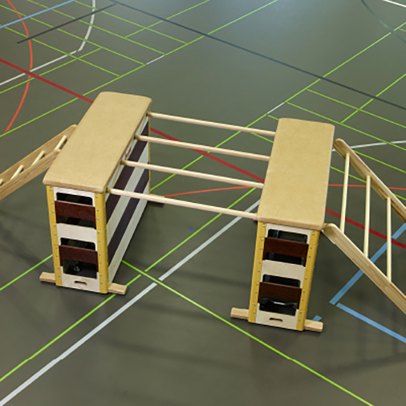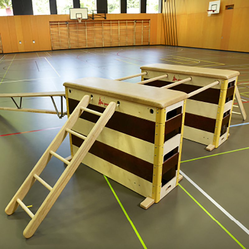 Das Wiba Sport Sprungkasten-Parcours-Set besteht aus zwei Sprungkästen, vier Holmen und zwei Leitern. Die Kastenteile sind stirnseitig mit Aussparungen zum Einhängen der Leitern versehen, längsseitig verfügt das oberste Element auf jeder Seite über je 4 Bohrungen zur Aufnahme der ovalen Holme. In Kombination mit Turnbänken und weiteren Geräten lassen sich zahlreiche Übungsformen realisieren, wodurch das Sprungkasten-Set zu einem universell einsetzbaren Sportgerät wird.